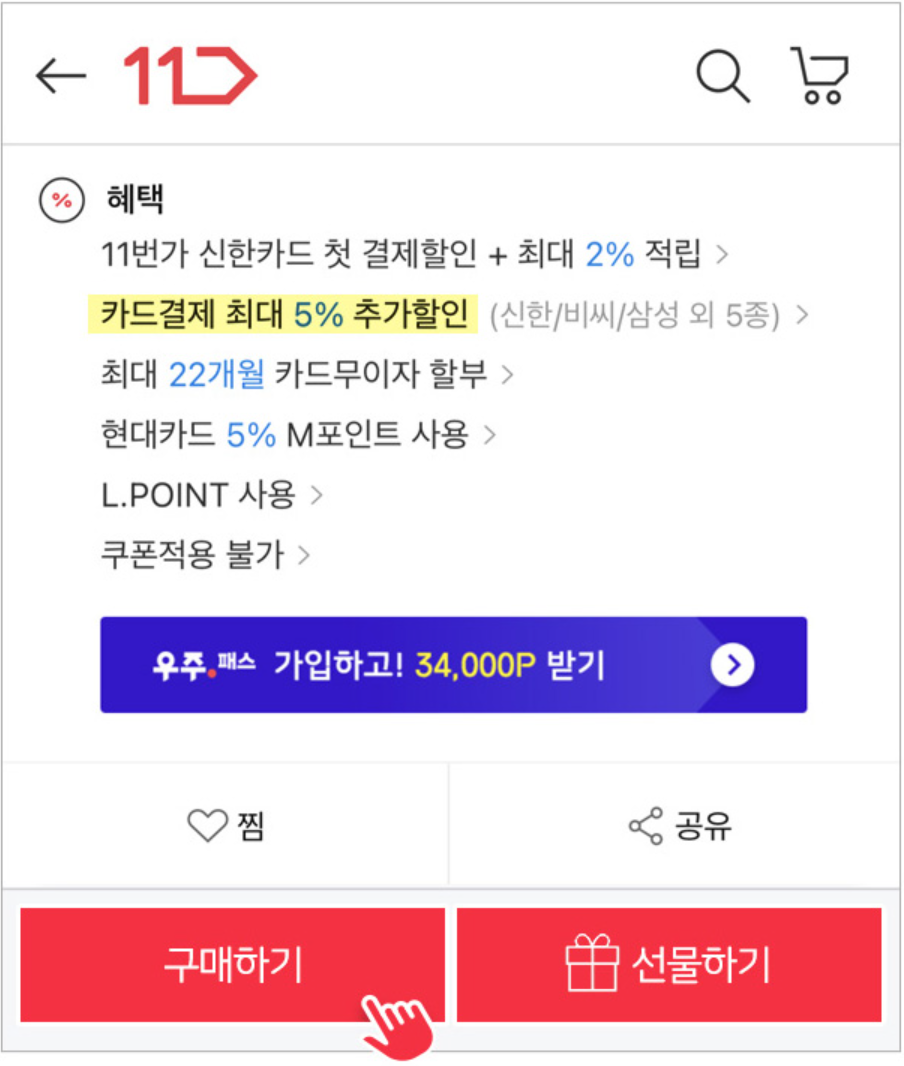 첫째, 카드추가할인 5% 적용 행사 제품 선택 후 구매하기/선물하기 클릭