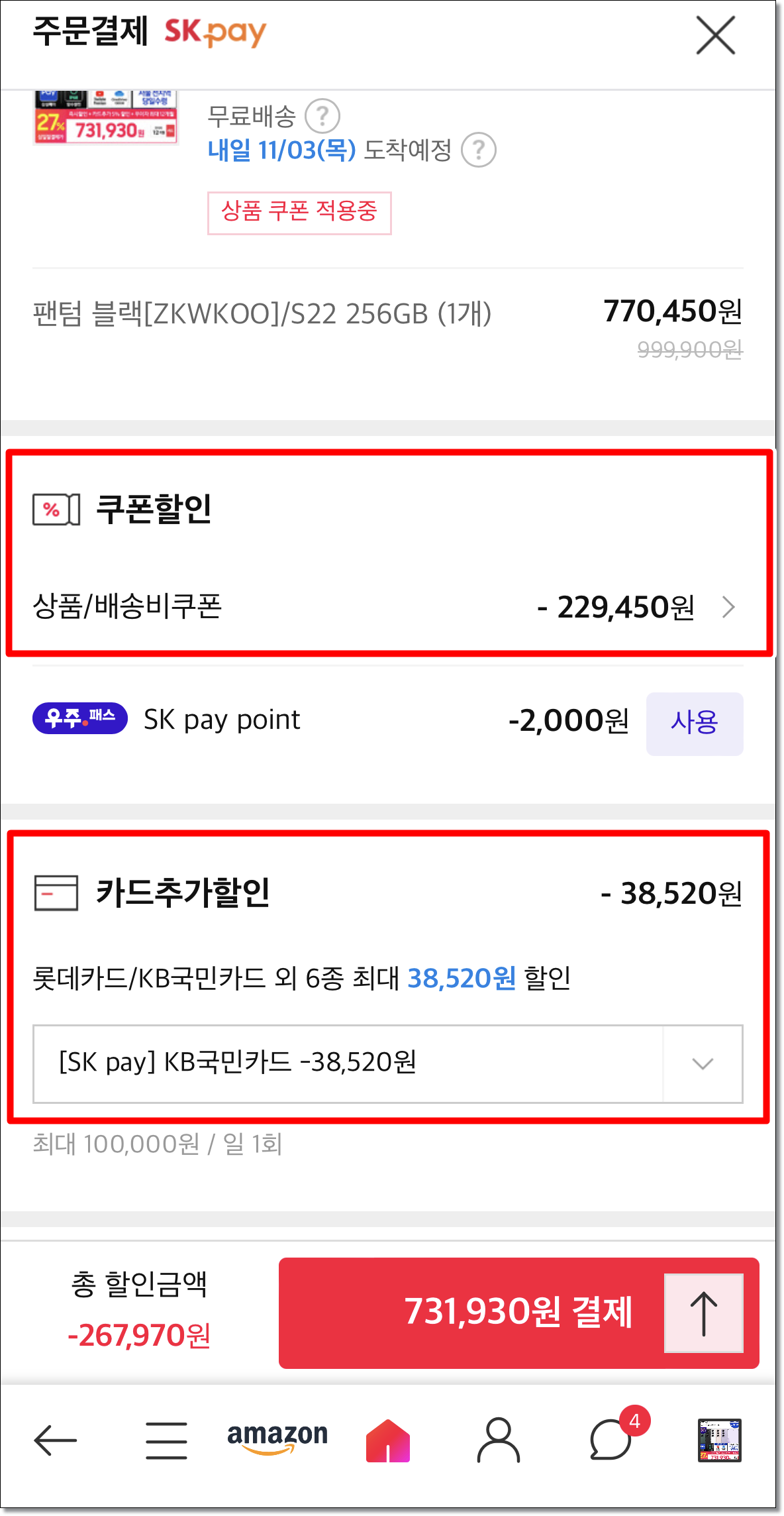 둘째, 주문/결제 페이지에서 카드추가할인 5% 카드사 선택 후 결제